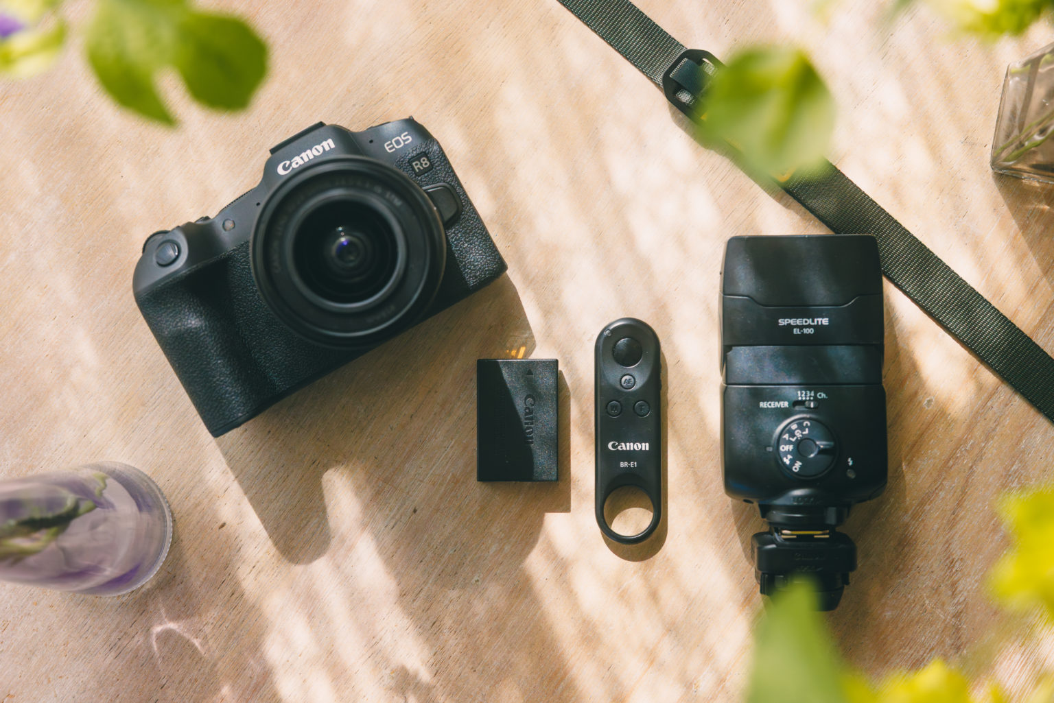 キヤノン社製のフルサイズカメラEOS R8です。ワイヤレスリモコンが付属しており、モニターを反転して撮影できるため、自撮りも簡単にできます。